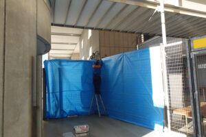射的の的(まと)は突風ですぐに倒れてしまうので、フェンス裏側に風よけのシートを張ります。